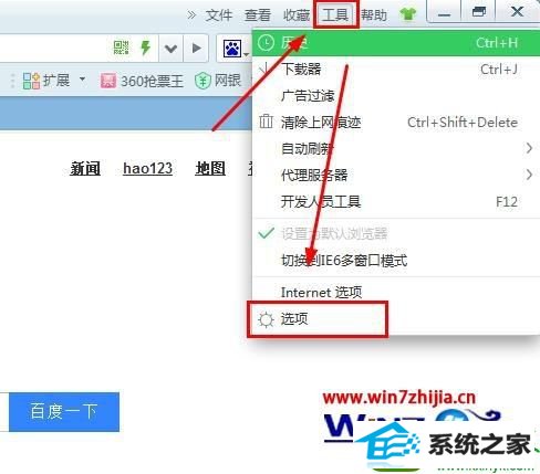 win10系统电脑使用过程中有不少朋友表示遇到过win10系统360浏览器开启地址栏显示图片放大镜开关的状况,当出现win10系统360浏览器开启地址栏显示图片放大镜开关的状况时,你不懂怎样解决win10系统360浏览器开启地址栏显示图片放大镜开关问题的话,那也没有关系,我们按照 1、打开浏览器,点击顶部菜单栏的工具; 2、在工具弹出的下拉框中点击选项;这样的方式进行电脑操作,就可以将win10系统360浏览器开启地址栏显示图片放大镜开关的状况处理解决。这一次教程中,小编会把具体的详细的步骤告诉大家: