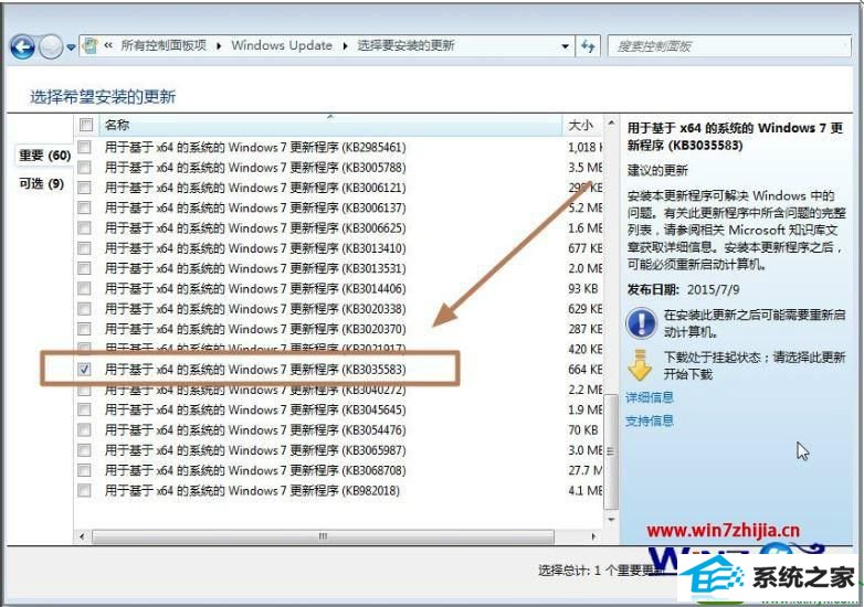 2、要查看可用更新中,我们可以找到kb3035583补丁,只需要将这个补丁安装上即可,若找不到此补丁,更新最新也没有,那么证明你的windows许可是批量企业版的,不可以免费升级到win10系统;