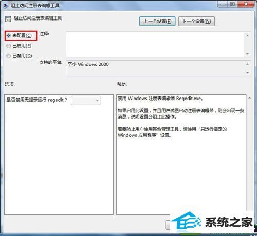 5.弹出的编辑器中,我们选择未配置,这样就关闭了禁用,然后重试一下即可打开注册表。如图五