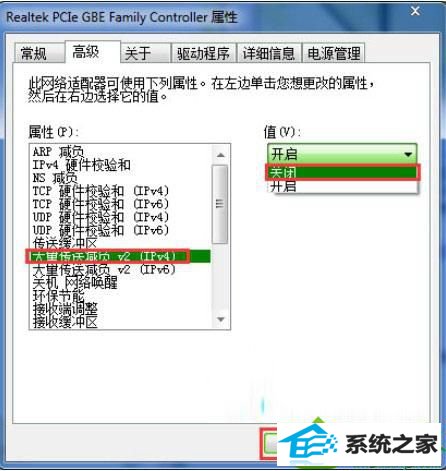 3、然后选中“大型传送分载 v2(ipv4)”,将其设置为“关闭”,再点击确定按钮,即可。