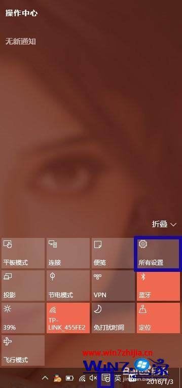 1、首先在win7系统中点击任务栏右侧“操作中心”,然后点击“所有设施”;