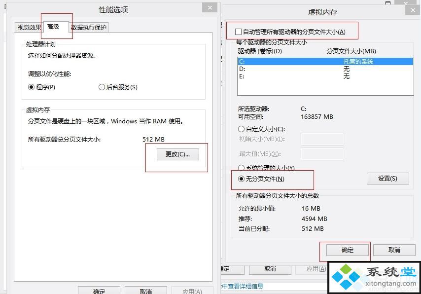 3、选择“高级”,点击虚拟内存中的“更改”,将“自动管理驱动器的分页文件大小”对勾消除,点击下面的“无分页文件”,点击“确定”直接。