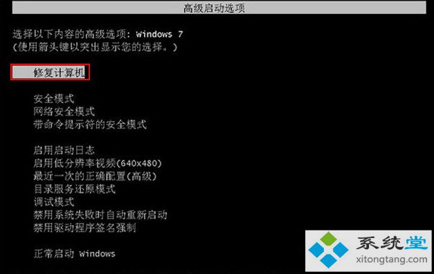 1、重启电脑,同时长按F8键进入高级启动选项界面,选择“修复计算机”按回车,如下图所示: