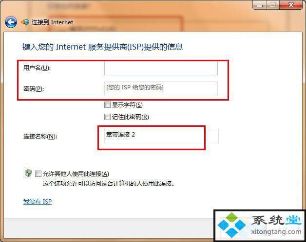 4.输入您办理宽带时电信公司给您提供的“用户名”和“密码”,连接名称默认为“宽带连接”,然后再点击“连接”;