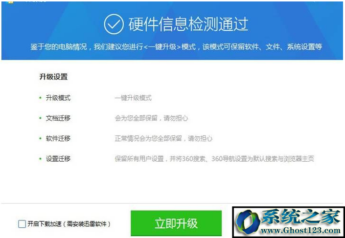 3、当弹出“硬件信息检测通过”,点击“立即更新”直接开始更新;