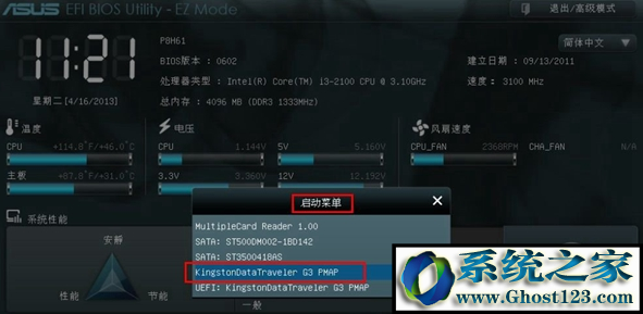1、首先插入制作的u盘启动盘,重启电脑开机时不停按“f8”便可调出快捷启动菜单,这里可以看到可以启动的几个选项,这里用方向键和回车操作,选择u盘后按回车键便可启动。