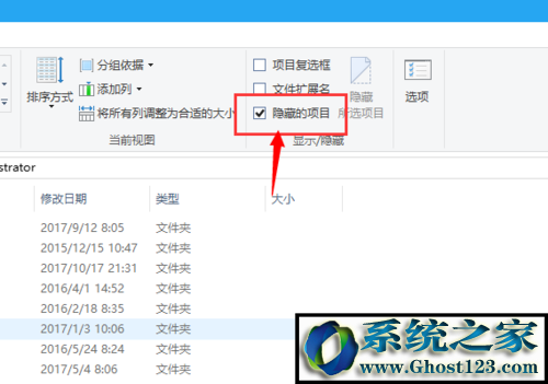 5:看到“隐藏的项目”之后,在前面打上勾勾,之后就可以显示系统文件了。
