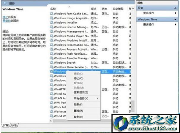 8、在右侧的服务清单中,找到win time服务,这里的服务是按首字母排列的,所以这个服务已在末属,在该服务上单击右键,选择启动。