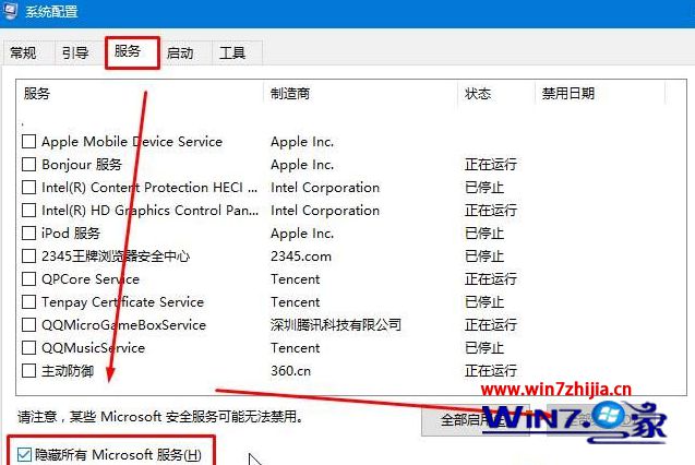 3、切换到“服务”选项卡,勾选“隐藏所有Microsoft 服务”,然后点击“全部禁用”点击应用并确定,在弹出的框中点击稍后重启;