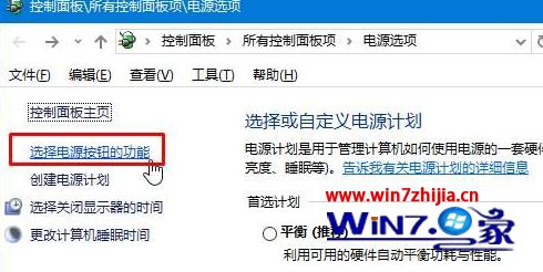 2、在电源选项界面左侧点击“选择电源按钮的功能”;