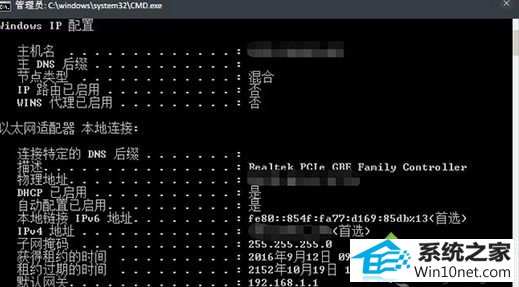 5、再在对话框输入:ipconfig/all,这个命令可以看到自己电脑的ip地址,子网掩码,dns服务器,默认网关;