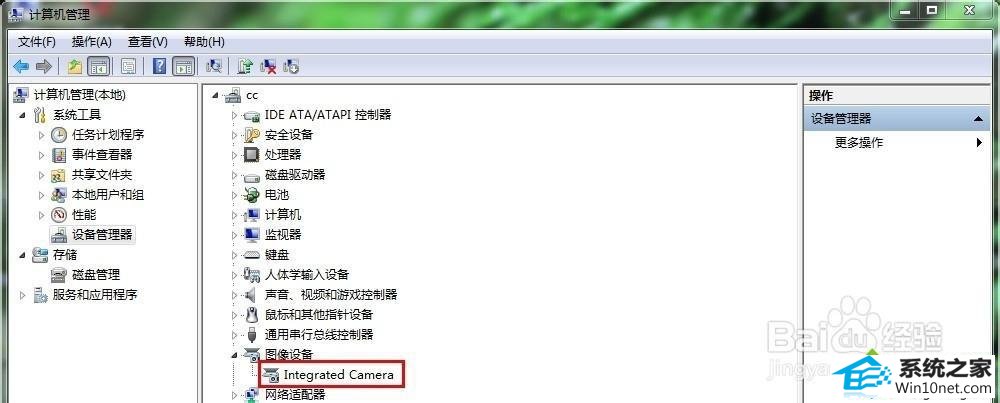 1、在桌面上右键单击计算机(win10)或我的电脑(xp),单击“管理”进入下图所示界面,点击右侧边栏的“设备管理器”,(1)如下图所示是驱动正常,说明不是驱动的问题;(2)如果没有驱动,或者摄像头设备上显示黄色叹号,说明驱动未安装好,需要进行安装驱动。