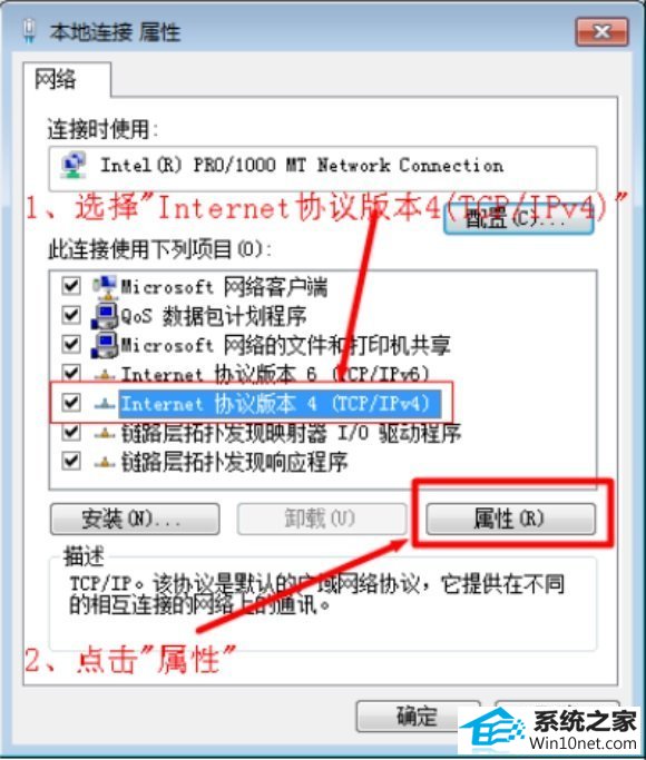 4.找到”internet协议版本4(TCp/ipv4)”鼠标右键选择”属性”打开。