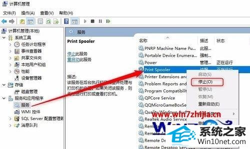 4、点击服务和应用程序——服务——print spooler ,右键——停止;