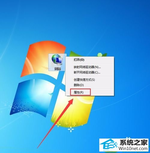 1:首先我们右键电脑桌面上的网络图标,在弹出的选项里,我们点击“属性” 如图